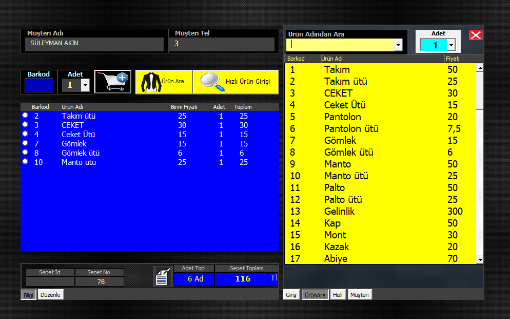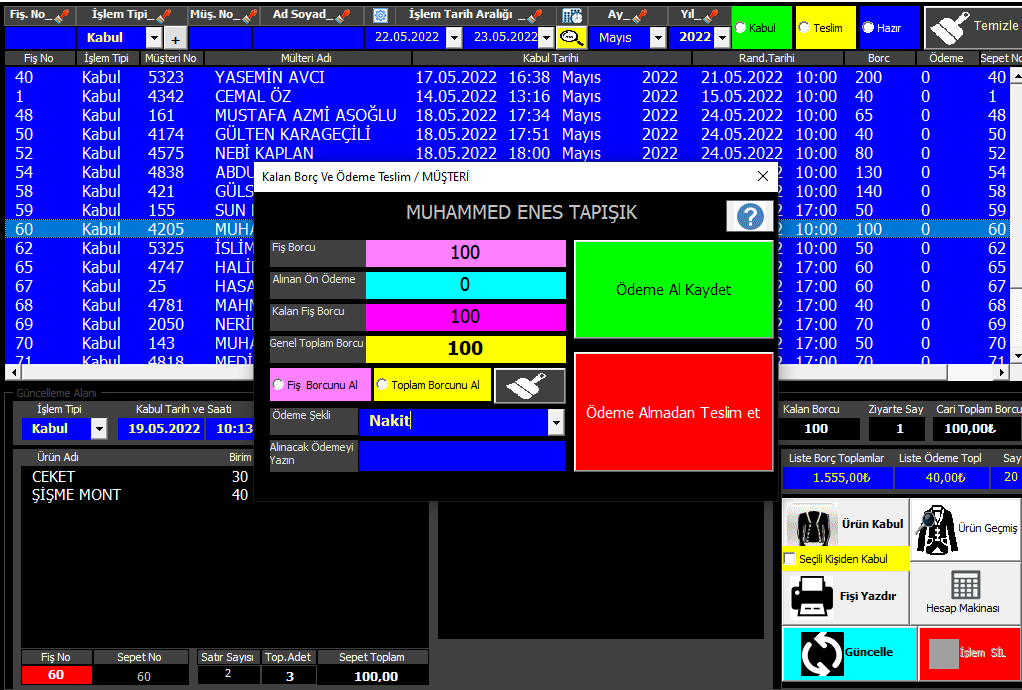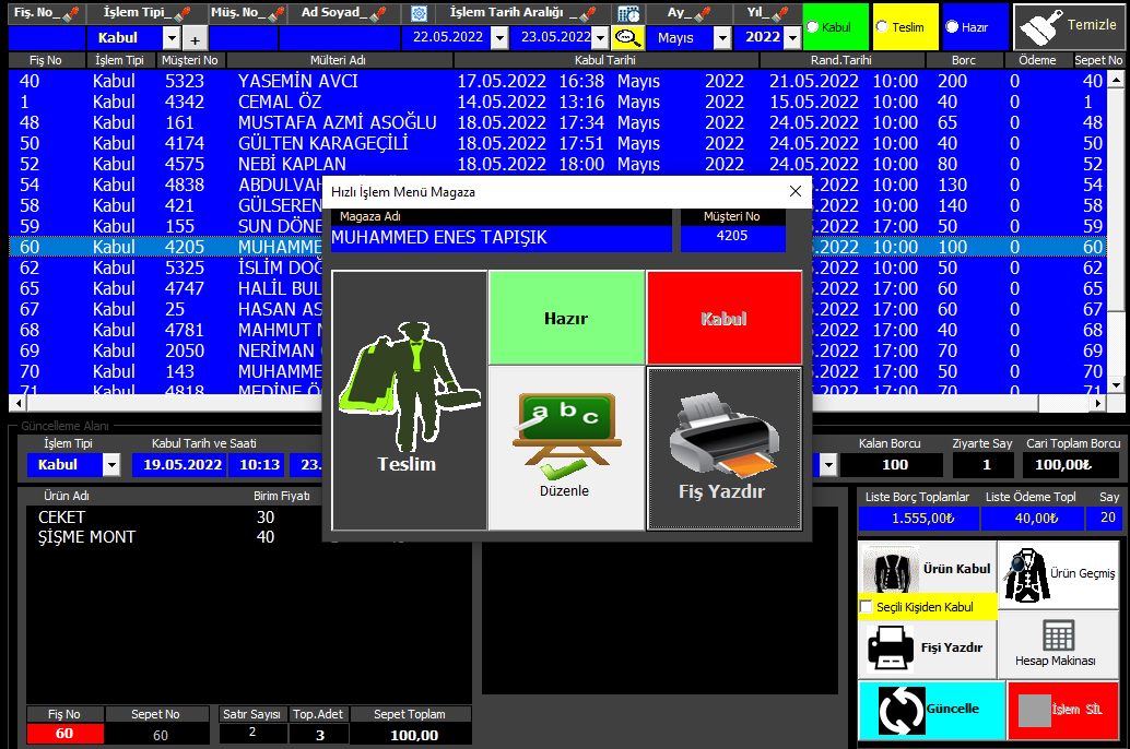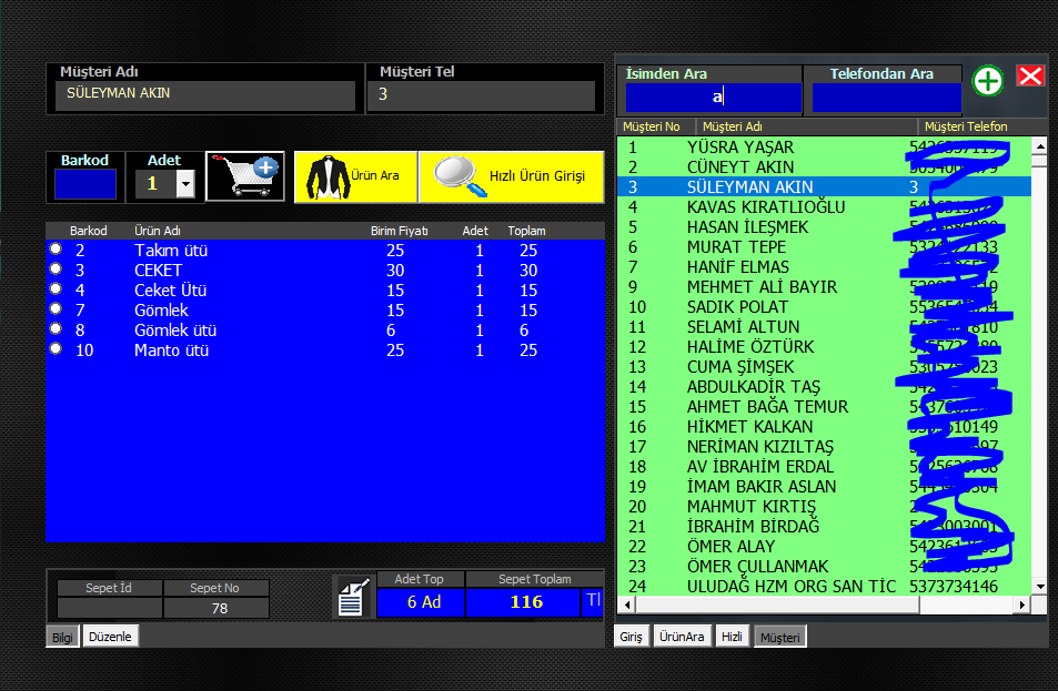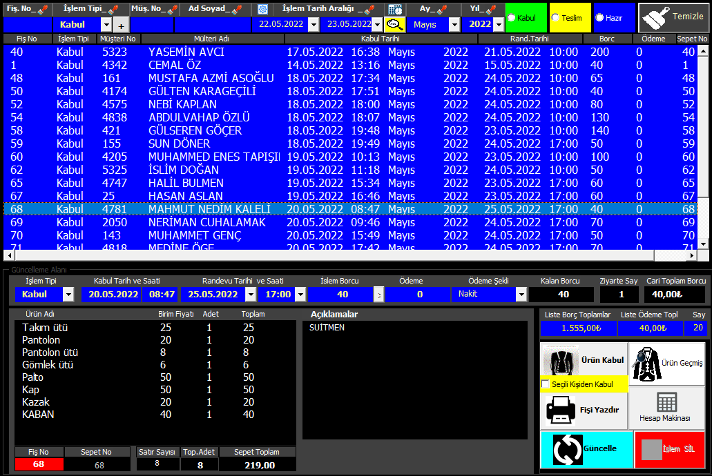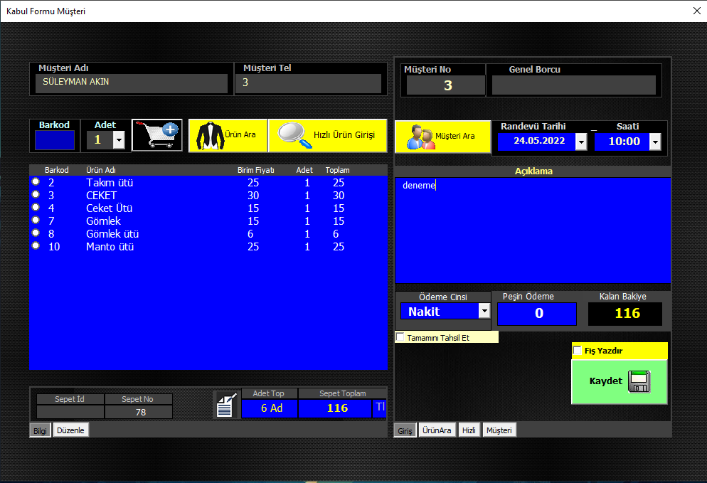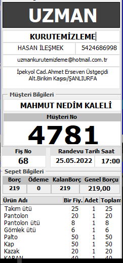 Kuru temizleme programı her müşteriye ayrı bir numara verir müşteri geldiğinde adını yazdığınızda otomatik olarak kayıtlı numarasını karşısına yazar hizmetlerinizin bedelini kayıt altında tutar eğer müşteri ödeme yapmazsa müşterinin bakiyesinde bakiye olarak gözükür raporlama özelliği ile hangi müşteri kaç defa gelmiş ne kadar borcu var hepsini rahat bir şekilde görebilirsiniz.